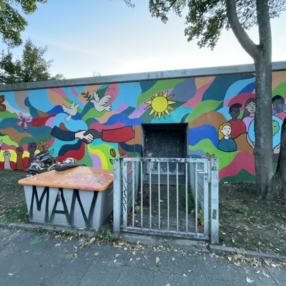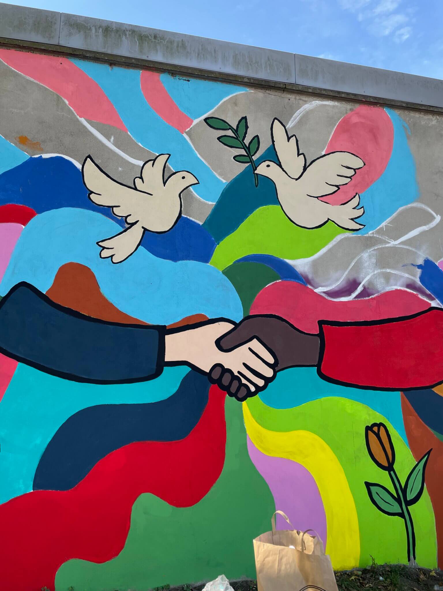 Gemeinsam mit Kunstlehrer:innen und Schüler:innen wurde das Werk anschließend umgesetzt. Entstanden ist ein farbenfrohes Bild, das die zentralen Werte unserer Schule nach Außen sichtbar macht.